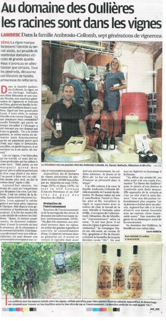 La Provence est le journal quotidien incontournable de notre belle région. Aussi, nous étions ravis lorque nous avons reçu un appel dix jours avant la parution de l’article de la journaliste de la Provence. Celle-ci, Laure Gareta, nous a expliqué que le journal publiait pendant tout l’été tous les vendredis un long article sur les domaines des viticoles de grande qualité dans la région. Et dieu sait qu’il y en a dans le coin ! Aussi, avons-nous été ravis d’avoir été sélectionnés comme le domaine viticole à Lambesc qui parait dans le journal quotidien.