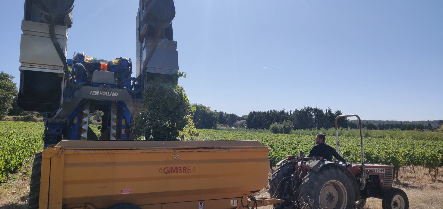 En moyenne, Daniel passe sur 4 rangs. Il déverse encore le contenu de la récolte dans la benne attachée au tracteur que Nicolas conduit.